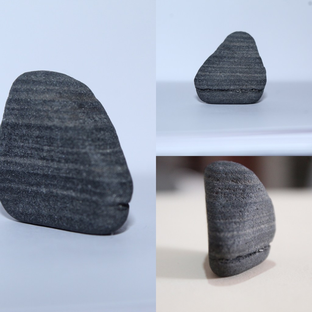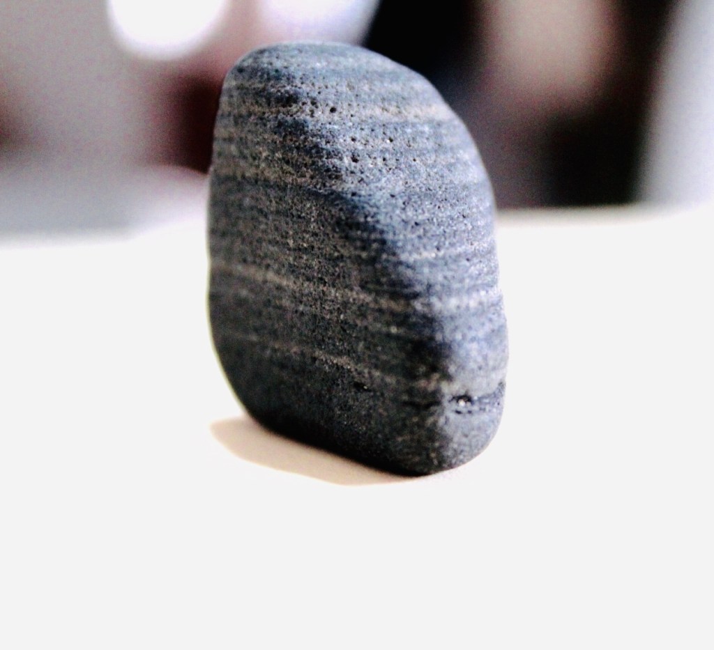 Y asi llego finalmente a la historia de esta piedra. Caminando la encontré y fue notoria, imaginate su color oscuro sobre una arena blanca, su aspecto rugoso sobre una arena fina, y como la vida, los regalos mas interesantes se muestran cuando pones atención a los detalles, dicen que el diablo se esconde en los detalles, sabes? Vi la piedra, y empecé ha hacer analogías con mi vida, así como ella es como está construida en verdad, capa tras capa, una y otra que se ha ido depositando sobre aquello que es mi ser a lo largo de los años, en ocasiones con una suavidad, en otras ocasiones, a través de fuerzas externas que finalmente unen las capas, pero, que sin una o la otra, la piedra simplemente no sería, simplemente sería algo distinto, o tal vez ni siquiera existiera. Y luego, parecía ser una estructura perfecta hasta que empecé a ver sus imperfecciones, empece a ver sus cicatrices, incluso una tan profunda y visible, como lo es la marca que yo tengo en mi cuello.