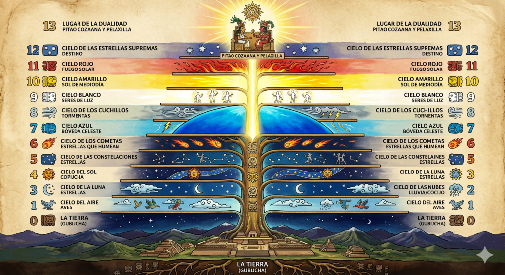 Los 13 dimensiones del universo según los zapotecas. Imagen creada con la IA.