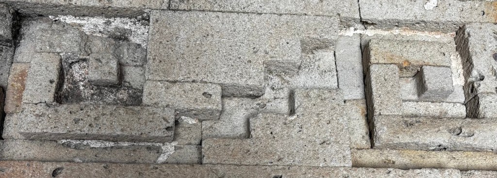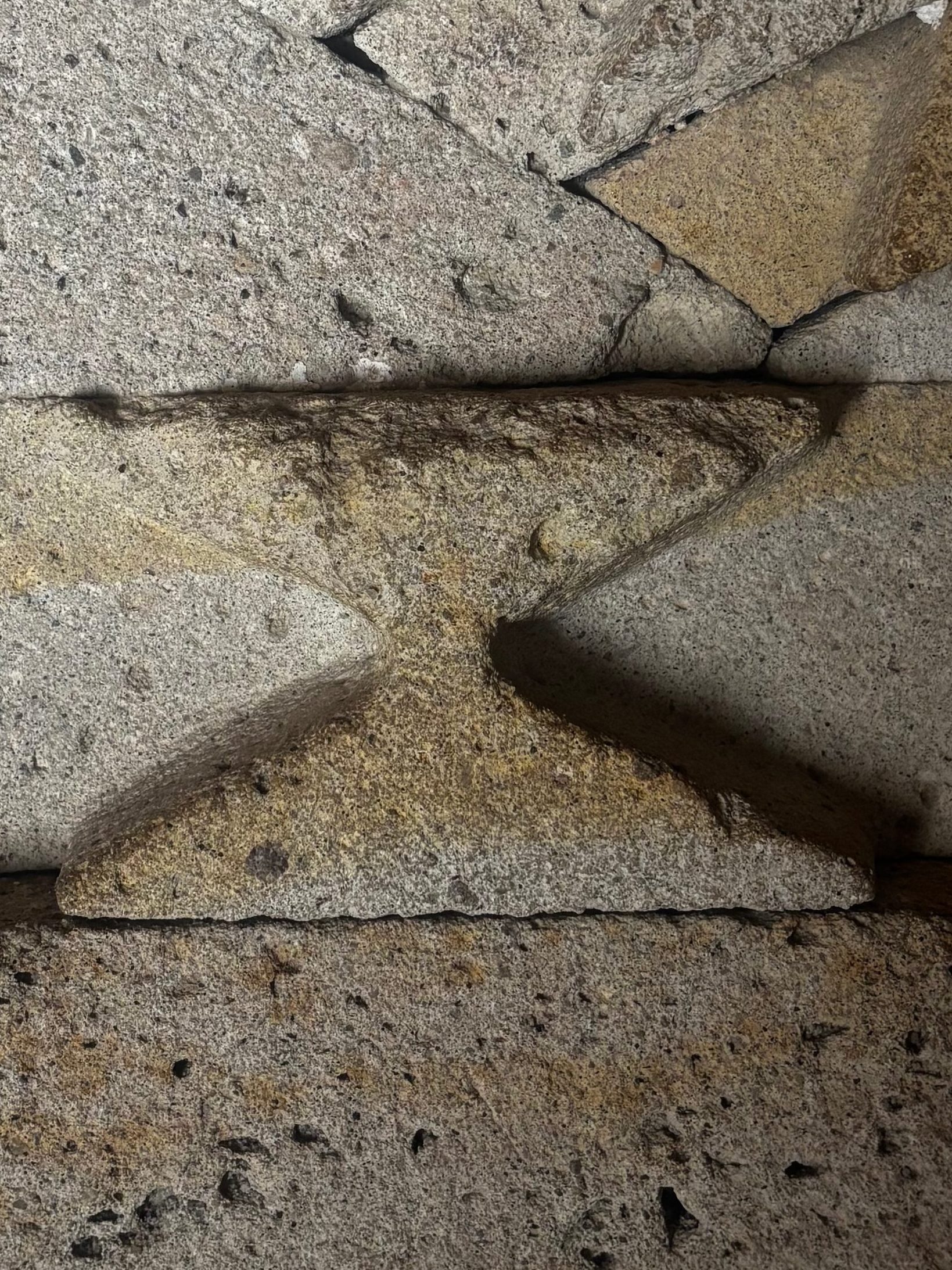 Sobre la pared del sur, esta ésta pequeña cuña en medio de todo un talmud. Parece insignificante sin embargo esa pequeña tallada es la piedra angular sobre la que inician a construir esta parte del templo, una interesante analogía sobre la estabilidad sobre la que se construye el templo zapoteca y tal vez en sincronía con la frase del maestro;